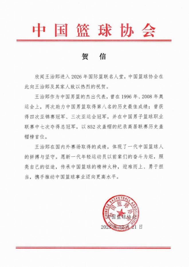 北京时间12月21日,中国球员王治郅入选FIBA名人堂,中国篮球协会发贺信表示祝贺。