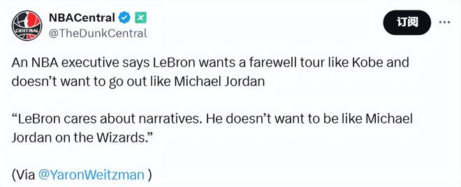 北京时间9月26日,据NBA记者Yaron Weitzman报道,一位NBA高管表示:“詹姆斯希望能像科比那样来一场告别巡演,而不想像迈克尔-乔丹在奇才队时那样结束职业生涯。”
