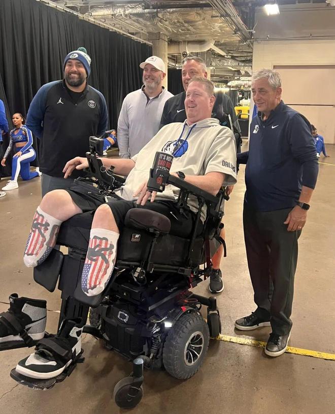 作为球队旧将,他今天来看独行侠比赛了,但是,是坐着轮椅来的...