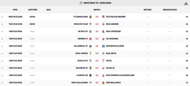 雷速体育10月30日宣 由于马德里竞技、巴塞罗那、毕尔巴鄂竞技、皇家马德里四队要在明年1月参加西班牙超级杯,为避免赛程冲突,西甲第19轮不得不提前进行。